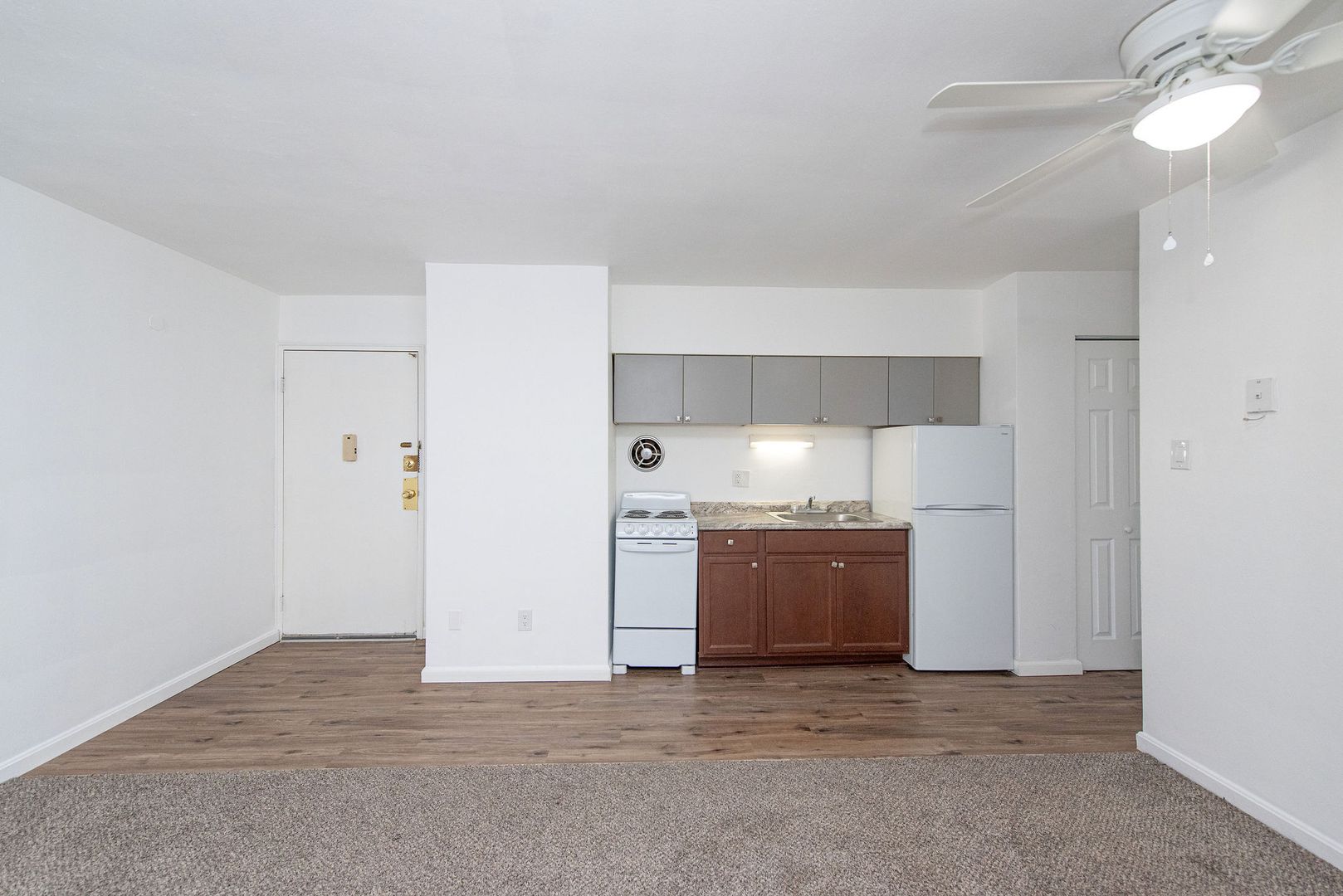 Charming 1 bedroom apartment in Cheviot. This 1 bedroom apartment features fresh carpet and paint, a galley kitchen with wood cabinets, a refrigerator, oven/range, exhaust fan, tons of closet space, and an A/C window unit. This apartment also has access to a laundry room and off-street parking. The resident is responsible for electricity. The building also features off-street parking, a coin laundry room, and storage units.